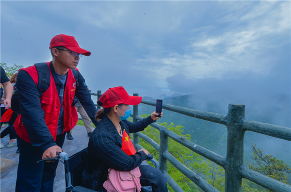 在費縣天蒙山景區(qū),黨員志愿者陪同殘疾人朋友乘坐索道、途經無障礙游步道到達了海拔近千米的世界第一人行玻璃懸索橋,和其他游客一同登山賞景,幫助他們實現無障礙旅游的夙愿。隨后,在《沂蒙山小調》誕生地,大家參觀展館,唱響沂蒙紅歌,追憶崢嶸往昔,緬懷革命先烈,開展了一堂生動的黨史教育課。