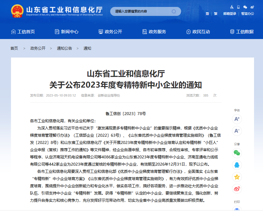 5月10日,山東省工業(yè)和信息化廳公布山東省2023年度專精特新中小企業(yè)名單,經(jīng)過層層嚴(yán)格遴選,山東文旅傳媒集團(tuán)旗下濟(jì)南伊特網(wǎng)絡(luò)信息有限公司(魯網(wǎng))成功被認(rèn)定為山東省專精特新中小企業(yè)。