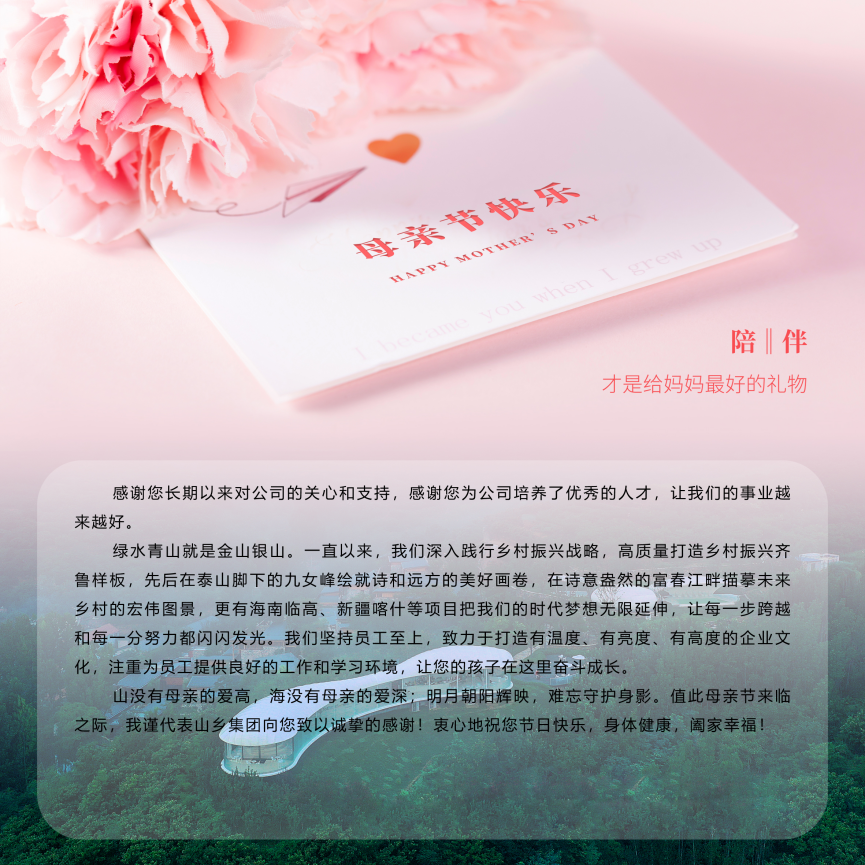 濃情五月,感恩母愛(ài)。母親節(jié)來(lái)臨之際,山鄉(xiāng)集團(tuán)有限公司(簡(jiǎn)稱“山鄉(xiāng)集團(tuán)”)工會(huì)組織“以愛(ài)之名·感恩有您”活動(dòng)致愛(ài)母親節(jié)。工會(huì)為員工母親寄送康乃馨花束,山東文旅集團(tuán)首席戰(zhàn)略官,山鄉(xiāng)集團(tuán)黨委書記、董事長(zhǎng)張建峰致信每一位員工的母親表達(dá)節(jié)日祝福。