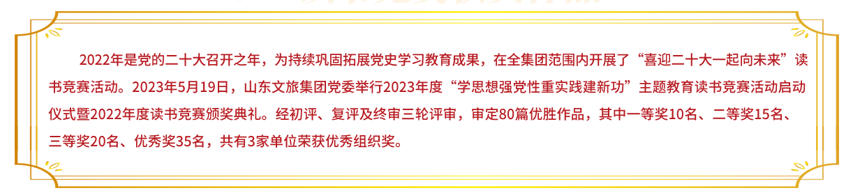 2023年是學(xué)習(xí)貫徹黨的二十大精神的開局之年,是實(shí)施“十四五”規(guī)劃承上啟下之年,為深入學(xué)習(xí)宣傳貫徹黨的二十大精神,扎實(shí)開展學(xué)習(xí)貫徹習(xí)近平新時(shí)代中國(guó)特色社會(huì)主義思想主題教育,在集團(tuán)形成愛讀書、讀好書、善讀書的濃厚氛圍,堅(jiān)持“規(guī)模效益年”年度工作方針,不斷加強(qiáng)企業(yè)文化和黨建工作,助推集團(tuán)高質(zhì)量發(fā)展,今年在全集團(tuán)范圍內(nèi)開展“學(xué)思想 強(qiáng)黨性 重實(shí)踐 建新功”主題教育讀書競(jìng)賽活動(dòng)。