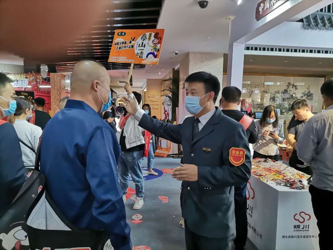 為了保障糖酒會的客流順暢,安保部、財務(wù)部、銷售部同事來到酒店大堂門前,擔(dān)負起車輛疏導(dǎo)、體溫檢測、安檢的工作,保證展會人員及財務(wù)安全??吹骄频陠T工們的熱心服務(wù)和默默奉獻,很多參展商紛紛豎起大拇指,他們說:“你們讓我親身感受到了什么叫‘好客山東’,有好服務(wù)才能有好心情!”