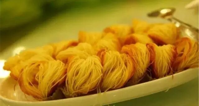 這清油盤絲餅很是精細(xì),所以做來也是極其繁瑣的,所謂“盤絲”,是指要將面抻至極細(xì),細(xì)如銀絲龍須,可以在銀針空穿過。而所謂“清油”,是相對(duì)葷油而言,做盤絲餅時(shí),抻好的面要刷油以防黏連,再盤成圓形煎烙,花生榨油香醇,做盤絲餅最是香。