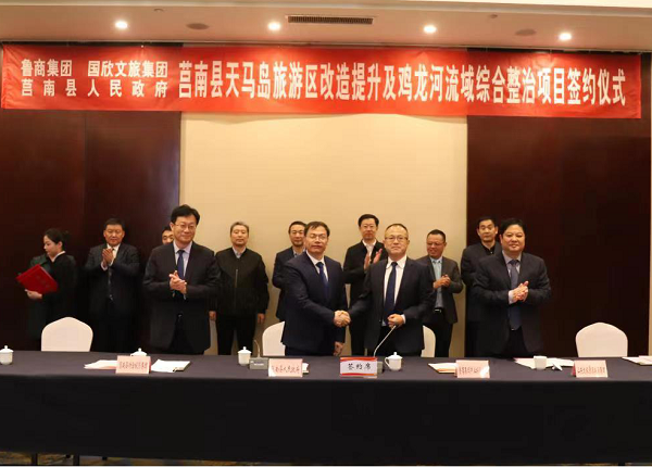 在高洪雷、侯曉濱等領導的共同見證下,山東文旅景區(qū)投資集團、魯商產(chǎn)業(yè)投資公司、莒南縣政府、莒南縣財金投資集團四方簽約天馬島旅游區(qū)項目;魯商國坤(山東)土地發(fā)展有限公司、莒南縣政府雙方簽約莒南縣雞龍河流域綜合整治項目。項目簽約后,莒南縣將分步提升天馬島旅游區(qū),并通過建設水田示范園、生態(tài)河道、濕地公園、美麗鄉(xiāng)村建設等將雞龍河領域塑造成城市濱水空間。