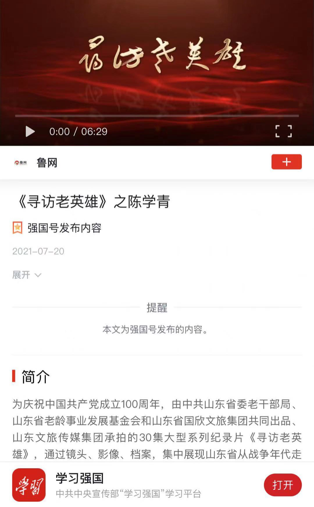 銘記歷史,致敬英雄。由中共山東省委老干部局、山東省老齡事業(yè)發(fā)展基金會和山東省國欣文旅集團聯(lián)合出品、山東文旅傳媒集團承拍的30集大型系列紀錄片《尋訪老英雄》,歷經(jīng)半年多的尋訪、拍攝和后期制作,日前完成全部攝制工作?!秾ぴL老英雄》通過鏡頭、影像、檔案集中展現(xiàn)了我省從戰(zhàn)爭年代走來的30位老黨員的革命事跡,帶我們一起重溫歷史,牢記初心,砥礪前行。該紀錄片正通過學習強國、山東商報、魯網(wǎng)、速豹新聞網(wǎng)等各大平臺陸續(xù)展播。