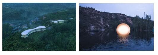 “故鄉(xiāng)的云”利用當?shù)卮迕耖e置院落,將山林掩映、山野自然融為一體,最大程度地賦予了居住空間詩意美學(xué)?!肮枢l(xiāng)的月”主體結(jié)構(gòu)與兩側(cè)峭壁巧妙結(jié)合,通過屋頂水面倒影,將屋頂天窗映成了一輪圓月,象征著四方游子對故鄉(xiāng)的獨特眷戀。