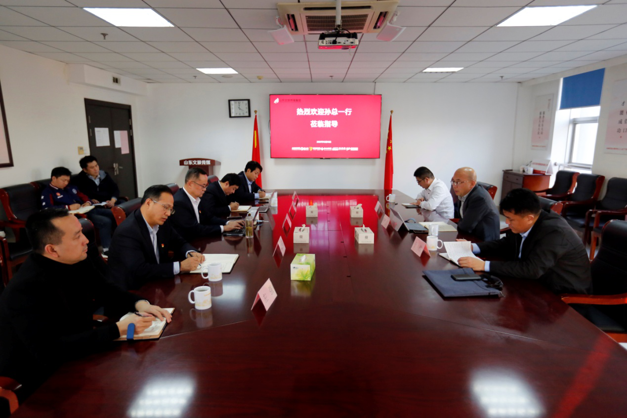 調(diào)研中,孫超參觀了山東文旅傳媒集團(tuán)主要業(yè)務(wù)部位和山東省文旅產(chǎn)業(yè)創(chuàng)新研究院。在隨后的座談交流中,龐道鋒以“凝心聚力 規(guī)范創(chuàng)新”為主題,詳細(xì)匯報(bào)了山東文旅傳媒集團(tuán)黨委政治建設(shè)、思想建設(shè)、組織建設(shè)、制度建設(shè)和黨風(fēng)廉政建設(shè)等方面的工作,并就意識(shí)形態(tài)工作“1234567”工作法、黨史學(xué)習(xí)教育創(chuàng)新“七個(gè)一”和“四清”廉潔文化體系等工作創(chuàng)新進(jìn)行了重點(diǎn)匯報(bào)。龐道鋒表示,山東文旅傳媒集團(tuán)黨委將堅(jiān)持以習(xí)近平新時(shí)代中國(guó)特色社會(huì)主義思想為指導(dǎo),以實(shí)際行動(dòng)增強(qiáng)“四個(gè)意識(shí)”、堅(jiān)定“四個(gè)自信”、做到“兩個(gè)維護(hù)”,積極擔(dān)當(dāng)作為、拼搏奮斗。山東文旅傳媒集團(tuán)黨委委員、總經(jīng)理王法爭(zhēng)以“蓄勢(shì)·起跑”為主題,以扎實(shí)的數(shù)據(jù)作了2021年1-11月的經(jīng)營(yíng)工作匯報(bào),并對(duì)2021年的經(jīng)營(yíng)指標(biāo)及2022年的工作前景進(jìn)行了展望。