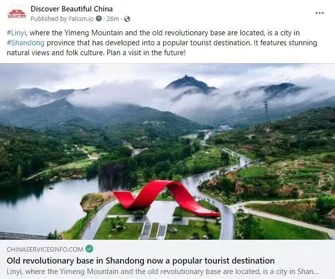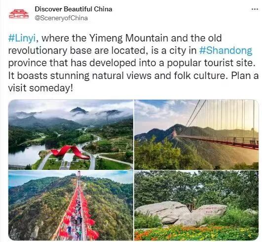 近日,中國日報的Twitter與Facebook賬號“Discover Beautiful China”點贊山東文旅天蒙景區(qū)美景,“山東省臨沂市是沂蒙山所在地,這里曾是沂蒙山革命根據(jù)地。如今,沂蒙革命老區(qū)已蛻變?yōu)闊衢T的旅游目的地(山東文旅沂蒙山天蒙景區(qū)),以其鬼斧神工的自然景觀和民間文化著稱,值得一看!”