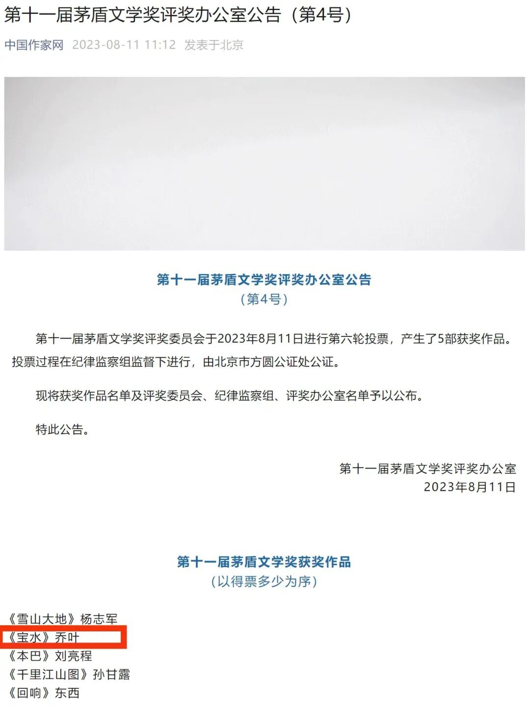 8月11日,第十一屆茅盾文學獎獲獎作品名單揭曉,其中,作家喬葉的《寶水》榜上有名。