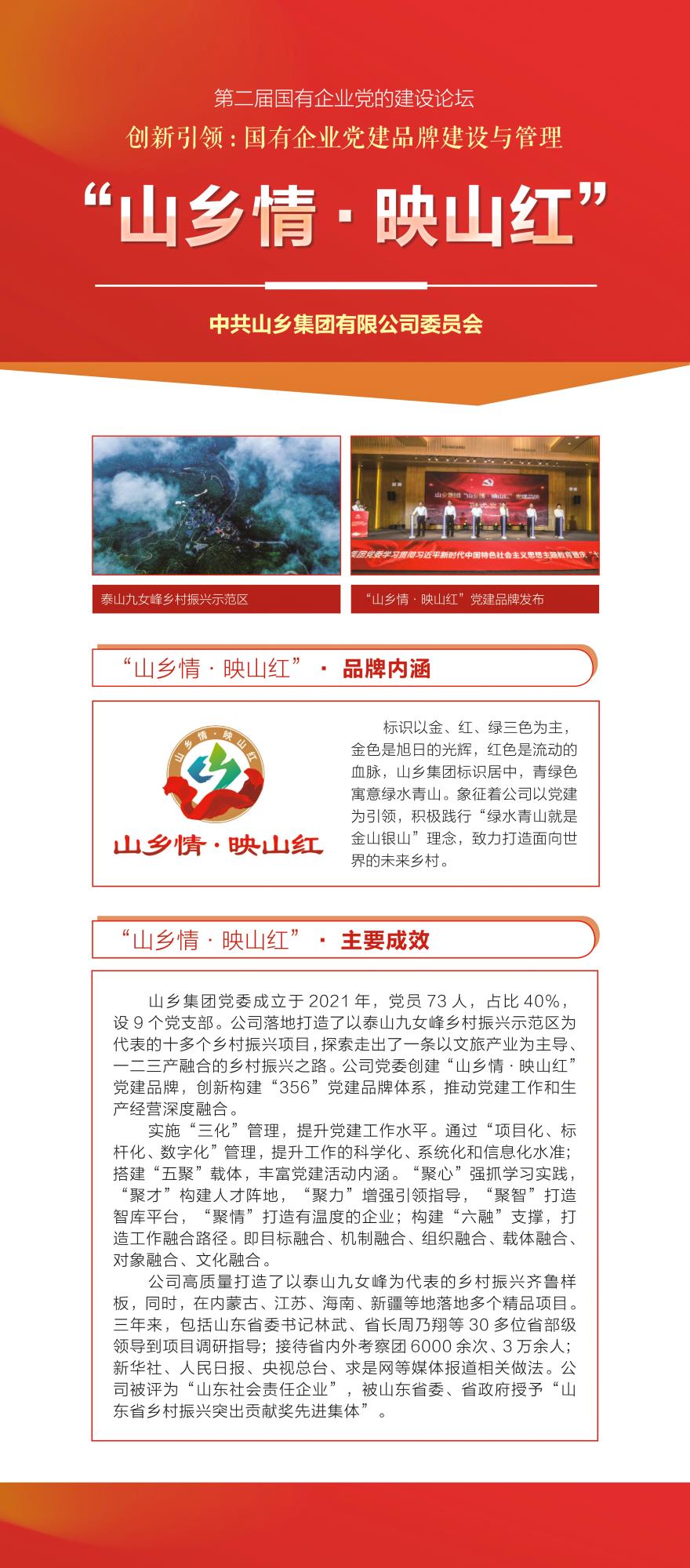 10月19日至20日,由中國企業(yè)改革與發(fā)展研究會和《國企》雜志主辦、山東省管企業(yè)黨建與思想政治工作研究會承辦的第二屆國有企業(yè)黨的建設(shè)論壇在山東濟(jì)南舉辦。本次論壇以《創(chuàng)新引領(lǐng):國有企業(yè)黨建品牌建設(shè)與管理》為主題。論壇上,山鄉(xiāng)集團(tuán)黨委就“山鄉(xiāng)情·映山紅”黨建品牌作典型發(fā)言,“山鄉(xiāng)情·映山紅”、索菲特黨支部黨建引領(lǐng)型“新動能方程”、九女峰公司黨支部“黨建云·故鄉(xiāng)情”三個黨建品牌在論壇上獲得展示。文旅景區(qū)黨委“擦亮‘沂蒙紅’黨建品牌 引領(lǐng)山岳型景區(qū)創(chuàng)新發(fā)展”、山鄉(xiāng)集團(tuán)黨委“山鄉(xiāng)情·映山紅”榮獲國企黨建品牌建設(shè)優(yōu)秀案例。