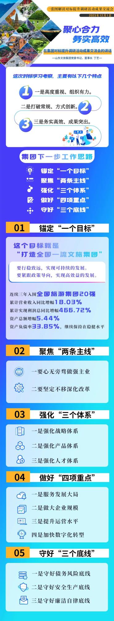 丁藝要求,下一步,山東文旅集團(tuán)要錨定“一個(gè)目標(biāo)”,聚焦“兩條主線”,強(qiáng)化“三個(gè)體系”,做好“四項(xiàng)重點(diǎn)”,守好“三個(gè)底線”。