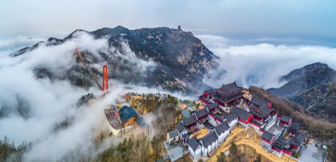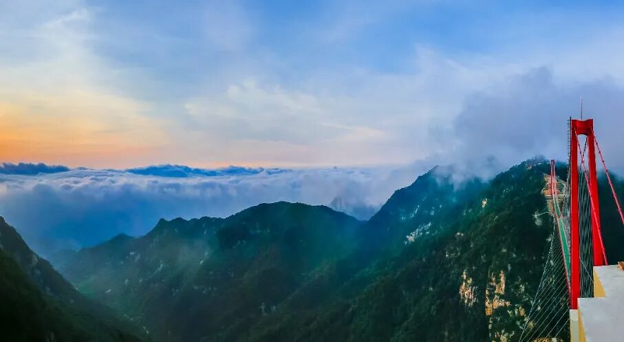 遼闊的云海之淵,望海樓仿佛被輕紗遮掩,若隱若現(xiàn),散發(fā)著神秘與瑰麗。佇立于云海之中的世界第一人行懸索橋,晨曦初露,金色的陽光灑落在云海上,云蒸霞蔚。
