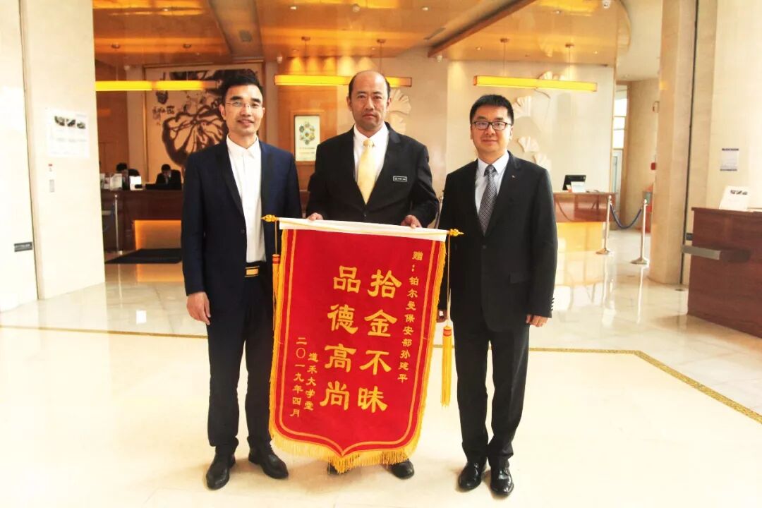 近日,臨沂魯商鉑爾曼大酒店收到了一份特殊禮物——“拾金不昧,品德高尚”的錦旗,這是曾在酒店參加道禾大學(xué)堂會(huì)議的一名客人送給保安部員工- 孫建平的的禮物。