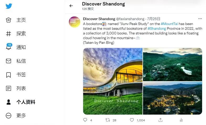 近日,新華社山東縣融海媒“Discover Shangdong”Twitter與Facebook賬號(hào)點(diǎn)贊泰山九女峰書房。“在泰山西麓,‘九女峰書房’被列為2022年山東省最美書店,藏書3000冊(cè)。流線型的建筑,猶如一朵懸停于山間的云。”