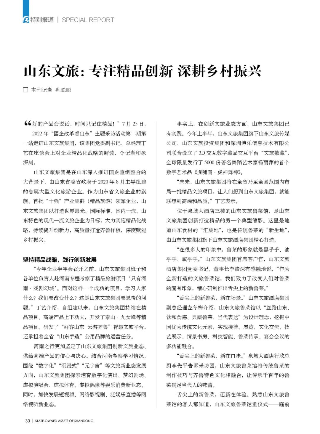 “好的產(chǎn)品會(huì)說話,時(shí)間只記住精品!”7月25日,2022年“國(guó)企改革看山東”主題采訪活動(dòng)第二期第一站走進(jìn)山東文旅集團(tuán),該集團(tuán)黨委副書記、總經(jīng)理丁藝在座談會(huì)上對(duì)企業(yè)精品化戰(zhàn)略的解讀,令記者印象深刻。