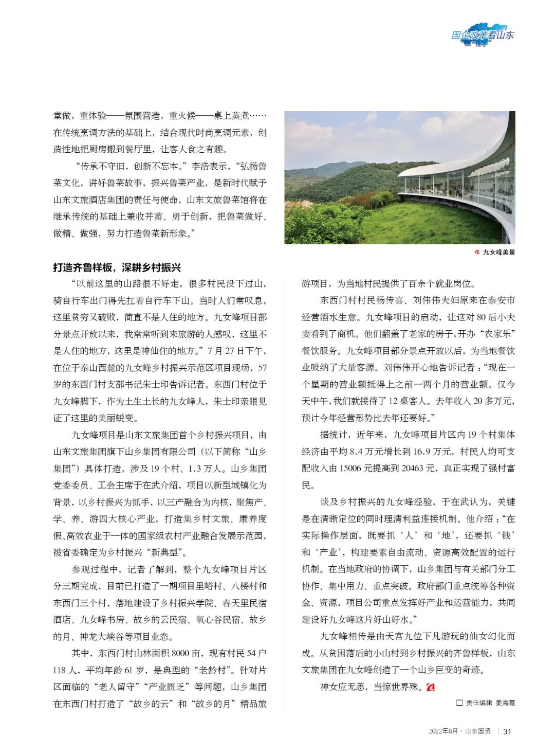 九女峰項(xiàng)目是山東文旅集團(tuán)首個(gè)鄉(xiāng)村振興項(xiàng)目,由山東文旅集團(tuán)旗下山鄉(xiāng)集團(tuán)有限公司(以下簡(jiǎn)稱“山鄉(xiāng)集團(tuán)”)具體打造,涉及19個(gè)村、1.3萬人。山鄉(xiāng)集團(tuán)黨委委員、工會(huì)主席于在武介紹,項(xiàng)目以新型城鎮(zhèn)化為背景,以鄉(xiāng)村振興為抓手,以三產(chǎn)融合為內(nèi)核,聚焦產(chǎn)、學(xué)、養(yǎng)、游四大核心產(chǎn)業(yè),打造集鄉(xiāng)村文旅、康養(yǎng)度假、高效農(nóng)業(yè)于一體的國(guó)家級(jí)農(nóng)村產(chǎn)業(yè)融合發(fā)展示范園,被省委確定為鄉(xiāng)村振興“新典型”。