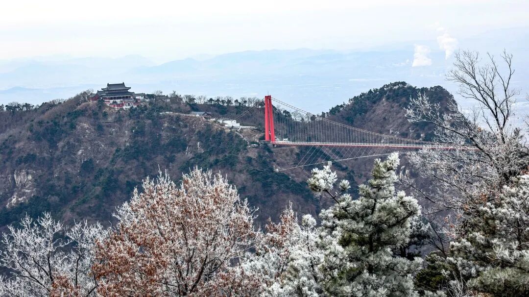 只見天蒙山上到處玉樹瓊花,晶瑩剔透,在霧凇的凝結下,根根樹枝猶如冰肌玉骨,閃閃發(fā)光,束束松針似開在枝頭的瓊花一樣,把整個山峰裝扮得如冰雕玉砌的童話世界。