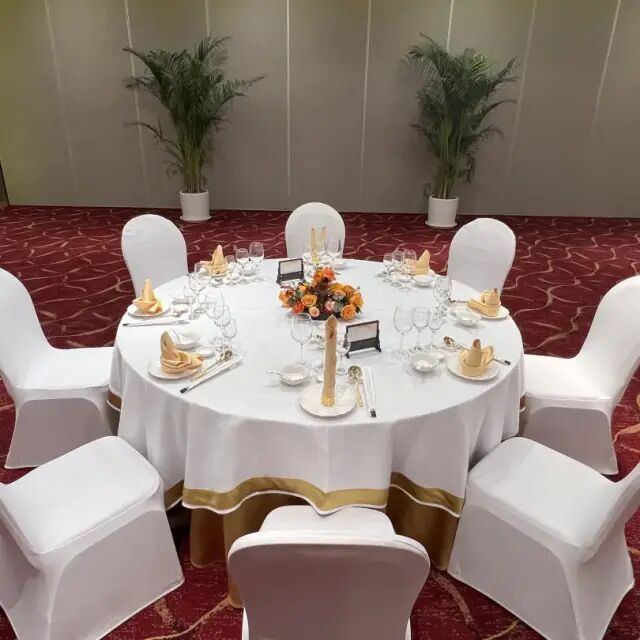 此次中餐宴會擺臺主題以豐收的季節(jié)“秋”為思路,秋天的陽光是金黃色的,帶有淺淺的溫柔,臺面主題插花與餐巾折花將秋季的美景表達的淋漓盡致,展現(xiàn)餐桌的精彩。