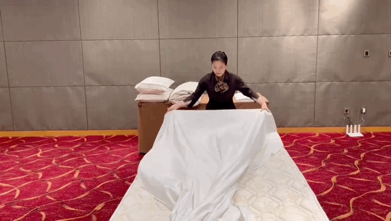 “臨近比賽,晚上做夢時自己都在鋪床?!彼鞣铺劂y座大飯店客房部樓層主管張后英笑著說道。在中式鋪床賽場上的她鋪床動作干脆利落,操作過程敏捷,每一步操作都嫻熟規(guī)范,榮譽的背后離不開日復(fù)一日的練習和團隊的支持。