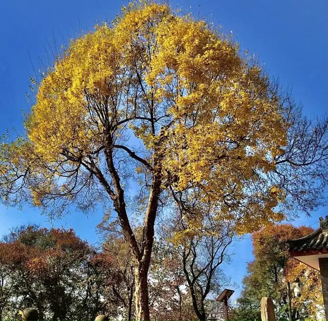 銀杏的觀賞期可以從金秋一直持續(xù)到初冬,從黃葉掛滿枝頭,到金葉翩翩起舞、黃金遍地,令人久久回味。大雄寶殿前的三顆銀杏樹(shù)高大茂盛,遙遙相望守護(hù)千年,同樣枝繁葉茂。