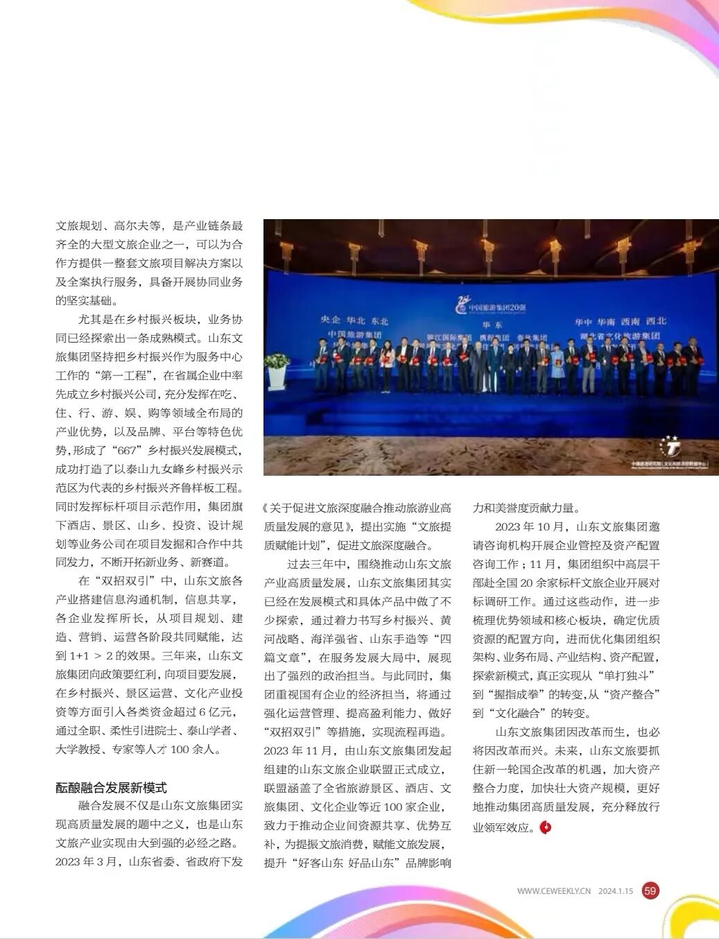 過去三年中,圍繞推動(dòng)山東文旅產(chǎn)業(yè)高質(zhì)量發(fā)展,山東文旅集團(tuán)其實(shí)已經(jīng)在發(fā)展模式和具體產(chǎn)品中做了不少探索,通過著力書寫鄉(xiāng)村振興、黃河戰(zhàn)略、海洋強(qiáng)省、山東手造等“四篇文章”,在服務(wù)發(fā)展大局中,展現(xiàn)出了強(qiáng)烈的政治擔(dān)當(dāng)。與此同時(shí),集團(tuán)重視國(guó)有企業(yè)的經(jīng)濟(jì)擔(dān)當(dāng),將通過強(qiáng)化運(yùn)營(yíng)管理、提高盈利能力、做好“雙招雙引”等措施,實(shí)現(xiàn)流程再造。2023年11月,由山東文旅集團(tuán)發(fā)起組建的山東文旅企業(yè)聯(lián)盟正式成立,聯(lián)盟涵蓋了全省旅游景區(qū)、酒店、文旅集團(tuán)、文化企業(yè)等近100家企業(yè),致力于推動(dòng)企業(yè)間資源共享、優(yōu)勢(shì)互補(bǔ),為提振文旅消費(fèi),賦能文旅發(fā)展,提升“好客山東 好品山東”品牌影響力和美譽(yù)度貢獻(xiàn)力量。